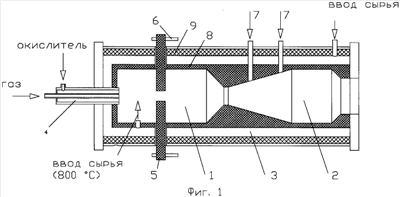 Однако в данном устройстве не предусмотрен теплообменник для рекуперации тепла отходящих газов, что существенно снижает КПД установки. Кроме того, нагрев плазмообразующего газа и вводимого сырья осуществляется исключительно за счет энергии дугового разряда, что существенно увеличивает затраты электроэнергии на проведение процесса. В предлагаемом нами способе предусмотрен как процесс рекуперации тепла (для подогрева вводимого сырья), так и дополнительный нагрев за счет частичного сжигания сырья.