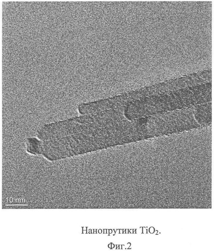 На фиг.2 приведено изображение отдельных нанопрутков TiO2, полученное на просвечивающем электронном микроскопе.