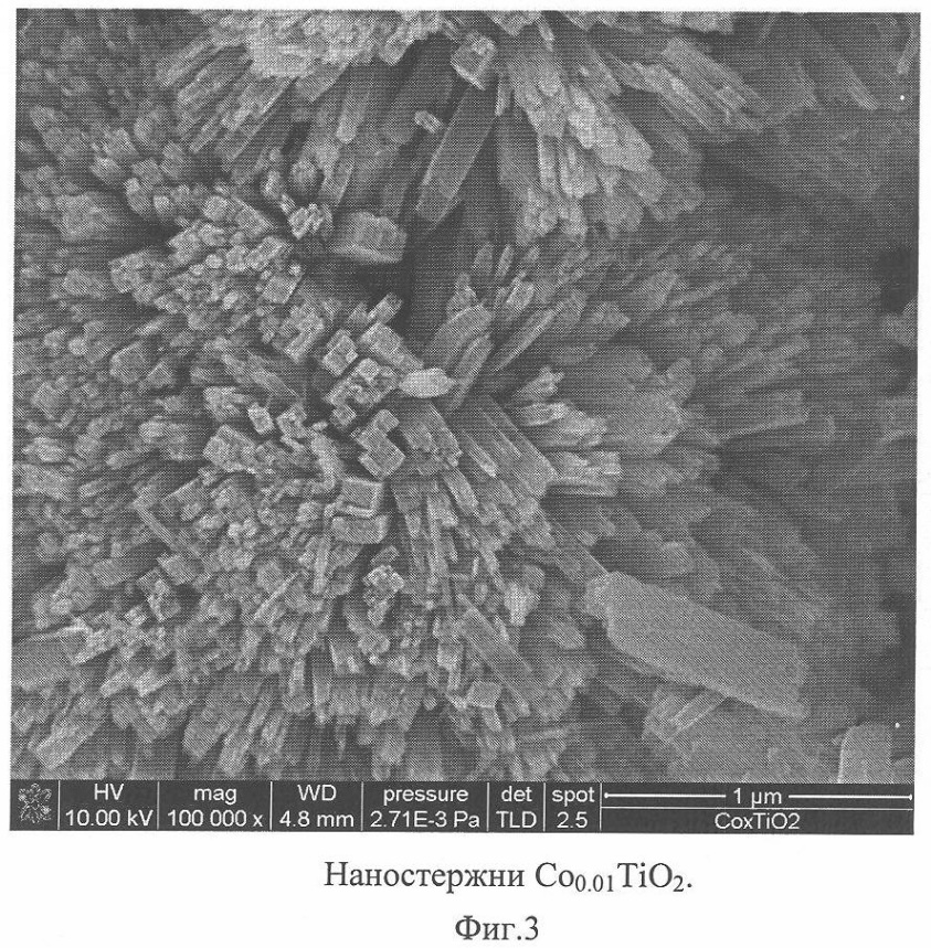 На фиг.3 приведено изображение наностержней Co0,01TiO2, полученное на сканирующем электронном микроскопе.
