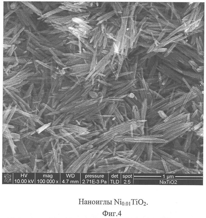 Пример 4. Берут 0,5 г дигидрида титана (TiH2) и растворяют в 15 мл разбавленной водой 1:2 37%-ной соляной кислоте (HCl). Получают раствор, содержащий Ti3+, при соотношении Ti3+:Cl1-, равном 1:6. К полученному раствору добавляют воду до общего объема 30 мл и 1,25 г соли дихлорида никеля гидрата (NiCl2·6H2O), а затем нагревают при 130°С в течение 20 ч. Затем охлаждают до комнатной температуры, осадок отфильтровывают, промывают водой и этанолом и сушат при температуре 80°С в течение 2-х ч. Согласно данным сканирующего электронно-микроскопического анализа полученный сухой продукт состоит из наноигл диаметром 10-20 нм и длиной несколько мкм диоксида титана, допированного никелем состава Ni0,01TiO2.