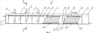 Каждый тонкослойный блок отстаивания установлен поперек камеры под углом к ее днищу с углом наклона в пределах 45°-70° и выполнен в виде тонкослойного блока параллельных пластин отстаивания, крайние пластины каждого блока имеют длину, большую, чем остальные, при этом нижний конец первой пластины блока упирается в днище корпуса, образуя зону отбора потока воды, а верхний конец последней пластины блока в камере 10 отстаивания расположен на одном уровне с боковыми стенками корпуса, а в камере отстаивания узла напорной флотации верхний конец последней пластины размещен выше уровня торцевой стенки камеры 12 сбора очищенной воды.