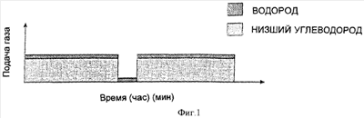 Кроме того, из типичного графика на фиг.2 видно, что в этом примере длительность подачи газообразного водорода составляет 21 час, в то время как длительность подачи газообразного метана составляет 17 часов. Однако скорость подачи газообразного водорода может быть выражена следующим образом: