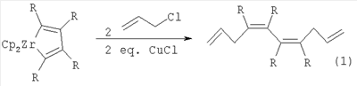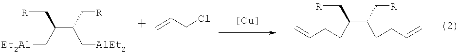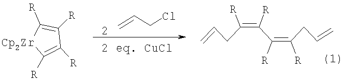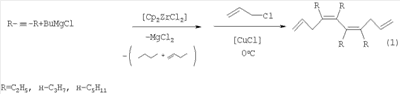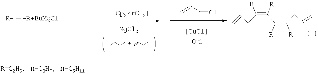 н-BuMgCl:Cp2ZrCl2=10:(22-26):(1,0-1,4) в атмосфере аргона при нормальном давлении в диэтиловом эфире в течение 3 ч с последующим добавлением при 0°С аллилхлорида в количестве 1,1 мольных эквивалента на взятый BuMgCl и CuCl в количестве 0,1 мольный эквивалент на взятый ацетилен с последующим перемешиванием реакционной массы при комнатной температуре в течение 3-5 ч.