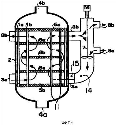 В корпусе 2 многотрубчатого реактора реакционные трубки 1b и 1с установлены неподвижно к решеткам для труб 5а и 5b. Отверстие для подачи материала сырья, через которое вводят газообразное сырье, и отверстие для выгрузки продукта, через которое продукт удаляют, показаны как 4а или 4b. Если поток технологического газа и поток теплоносителя представляют собой встречные потоки, то отсутствуют конкретные ограничения на направление потока технологического газа. Однако на фиг.1 вследствие того, что направление потока теплоносителя в корпусе реактора показано как восходящий поток, 4b означает отверстие для подачи сырья. На внешней границе корпуса реактора установлен круговой трубопровод 3а для введения теплоносителя. Теплоноситель, который находится под давлением, создаваемым циркуляционным насосом 7 для теплоносителя, поднимается по круговому трубопроводу 3а внутренней стороны корпуса реактора. Установкой каждой из множества направляющих перегородок 6а, имеющих окна вблизи центра корпуса реактора, и каждой из множества направляющих перегородок 6b, имеющих окна на внешней границе корпуса реактора в другом методе, направление потока изменяют, и тепловой поток возвращается из кругового трубопровода 3b к циркуляционному насосу. Часть теплоносителя, которая приняла тепло реакции, выходит из разгрузочной трубы, расположенной в верхней части циркуляционного насоса 7, охлаждается теплообменником (здесь показанным на чертеже) и вводится снова из трубопровода подачи теплоносителя 8а в реактор. Температуру теплоносителя регулируют, когда либо температуру, либо скорость возвратного потока теплоносителя, введенного из трубопровода подачи теплоносителя 8а, регулируют по контрольному термометру 14. Температурный контроль теплоносителя, однако, в зависимости от характеристики применяемого катализатора осуществляют так, что различие температур теплоносителя в трубопроводе подачи теплоносителя 8а и теплоносителя в трубопроводе разгрузки теплоносителя 8b может быть в диапазоне от 1 до 10°С и предпочтительно в диапазоне от 2 до 6°С.