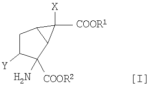 11. Сложноэфирное производное 2-амино-бицикло[3.1.0]гексан-2,6-дикарбоновой кислоты или его фармацевтически приемлемая соль по п.2, отличающееся тем, что в формуле [II] R2 представляет атом водорода; Х представляет атом фтора; и Y представляет -SR3 (где R3 такой же, как описано выше).