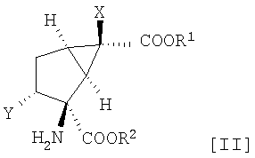 26. Сложноэфирное производное 2-амино-бицикло[3.1.0]гексан-2,6-дикарбоновой кислоты или его фармацевтически приемлемая соль по п.2, отличающееся тем, что в формуле [II] R2 представляет атом водорода; Х представляет атом фтора; Y представляет -OCHR3R4 (где R3 представляет атом водорода; R4 представляет нафтильную группу; и R1 представляет С1-10алкильную группу, С2-10алкенильную группу, С2-10алкинильную группу, С1-10алкильную группу, замещенную фенильной группой, гидроксиС2-10алкильную группу, галогенС1-10алкильную группу, азидоС1-10алкильную группу, аминоС2-10алкильную группу, С1-10алкоксикарбонилС1-10алкильную группу, фарнезильную группу, 4-морфолинилС1-10алкильную группу или С1-10алкильную группу, замещенную группой, представленной формулой-С(O)NRaRb (где Ra и Rb являются одинаковыми или различными, и каждый представляет атом водорода или С1-10алкильную группу).