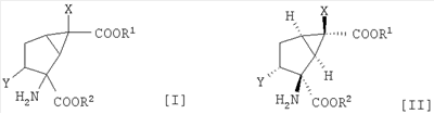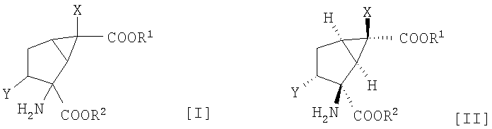 21. Сложноэфирное производное 2-амино-бицикло[3.1.0]гексан-2,6-дикарбоновой кислоты, его фармацевтически приемлемая соль по п.2, отличающееся тем, что в формуле [II] R2 представляет атом водорода; Х представляет атом фтора; Y представляет NHCHR3R4 (где R3 и R4 такие же, как описано выше); и