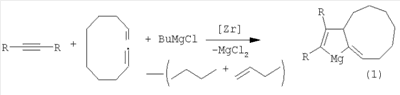 характеризующийся тем, что смесь циклонона-1,2-диена и диалкилацетилена (гекс-3-ин, окт-4-ин, дец-5-ин) подвергают взаимодействию с н-BuMgCl в присутствии катализатора цирконацендихлорида Cp2ZrCl2 в мольном соотношении циклонона-1,2-диен:диалкилацетилен:н-BuMgCl:Cp2ZrCl2=10:10:(22-26):(1,0-1,4) в атмосфере аргона при нормальном давлении в диэтиловом эфире, при комнатной температуре в течение 4-6 ч.