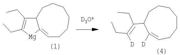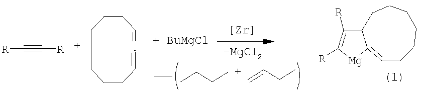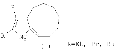 Указанные соединения могут найти применение в качестве компоненты каталитических систем в процессах олигомеризации и полимеризации олефинов и диеновых углеводородов, в тонком, промышленном органическом и металлоорганическом синтезе, а также в синтезе биологически активных препаратов. Известным способом не могут быть получены 11,12-диалкил-10-магнезабицикло[7.3.01,9]додека-8,11-диены общей формулы (1): 2TiCl2 (ТГФ, 20°С, 8 ч). Известный способ не позволяет получать 11,12-диалкил-10-магнезабицикло[7.3.01,9]додека-8,11-диены общей формулы (1). Таким образом, в литературе отсутствуют сведения по синтезу 11,12-диалкил-10-магнезабицикло[7.3.01,9]додека-8,11-диенов общей формулы (1). Предлагается новый способ синтеза 11,12-диалкил-10-магнезабицикло[7.3.01,9]додека-8,11-диенов общей формулы (1). Сущность способа заключается во взаимодействии эквимольной смеси циклонона-1,2-диена и диалкилацетилена (гекс-3-ин, окт-4-ин, дец-5-ин) с бутилмагнийхлоридом (н-BuMgCl) в присутствии катализатора цирконацендихлорида (Cp2ZrCl2), взятых в мольном соотношении циклонона-1,2-диен:диалкилацетилен:н-BuMgCl:Cp2ZrCl2=10:10:(22-26):(1.0-1.4), предпочтительно 10:10:24:1.2. Реакцию проводят в атмосфере аргона при комнатной температуре (20°С) и атмосферном давлении. Время реакции 4-6 часов, выход целевых продуктов 56-78%. В качестве растворителя необходимо использовать диэтиловый эфир, в других эфирных растворителях (ТГФ, диоксан) выход целевых продуктов (1) значительно снижается. Реакция протекает по схеме: Целевой продукт (1) образуется только лишь с участием циклонона-1,2-диена, диалкилзамещенных ацетиленов, н-BuMgCl и катализатора Cp2ZrCl2. В присутствии других катализаторов на основе комплексов переходных металлов (например, Zr(acac)4, Ср2TiCl2, Pd(acac)2, Ni(acac)2, Fe(асас)3) продукт (1) не образуется. Проведение реакции в присутствии катализатора Cp2ZrCl2 больше 1.4 ммоль не приводит к существенному увеличению выхода целевых продуктов (1). Использование в реакции катализатора Cp2ZrCl2 менее 1.0 ммоль снижает выход МОС (1), что связано со снижением каталитически активных центров в реакционной массе. Опыты проводили при комнатной температуре 20°С. При более высокой температуре (например, 50°С) увеличивается содержание продуктов уплотнения, при меньшей температуре (например, 0°С) снижается скорость реакции. Изменение соотношения исходных реагентов в сторону увеличения содержания н-BuMgCl по отношению к ацетилену или циклонона-1,2-диену не приводит к значительному повышению выхода целевых продуктов (1). Снижение количества н-BuMgCl по отношению к ацетилену или циклонона-1,2-диену уменьшает выход МОС (1). Отличия предлагаемого способа 1. В предлагаемом способе используются в качестве исходных соединений циклонона-1,2-диен, диалкилзамещенный ацетилен и н-BuMgCl с участием катализатора Cp2ZrCl2. В известном способе непредельные циклические магнийорганические соединения (3) получают из терминальных алленов, EtMgX, металлического Mg с участием катализатора Ср2TiCl2. Предлагаемый способ обладает следующими преимуществами: Способ позволяет получать с высокой селективностью 11,12-диалкил-10-магнезабицикло[7.3.01,9]додека-8,11-диены (1), синтез которых в литературе не описан. Способ поясняется следующими примерами: ПРИМЕР 1. В стеклянный реактор объемом 50 мл, установленный на магнитной мешалке, в атмосфере аргона помещают 1.2 ммоль Cp2ZrCl2, 10 ммоль циклонона-1,2-диена, 10 ммоль гекс-3-ина и при температуре 0°С 24 ммоль 
