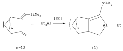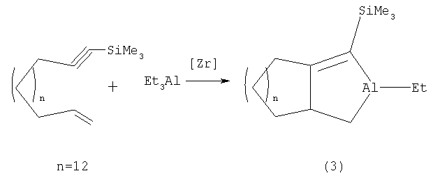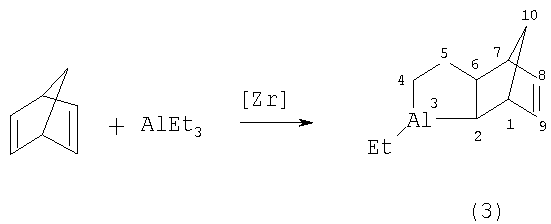 2-C5H5)2ZrCl2. Изв. АН. Сер. хим., 1992, №2, с.386-391) получения непредельного трициклического соединения, а именно 3-этил-3-алюминатрицикло[5.2.1.02,6]дец-8-ена (2) взаимодействием норборнадиена с Et3Al в присутствии катализатора Cp2ZrCl2 в углеводородных растворителях или без растворителя при температуре 20°С за 12-14 часов по схеме