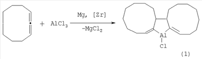 Изобретение относится к области органического синтеза, конкретно к способу получения новых алюминийорганических соединений. Указанное соединение может найти применение в качестве компоненты каталитических систем в процессах олиго- и полимеризации олефиновых, диеновых и ацетиленовых углеводородов, а также в тонком органическом и металлоорганическом синтезах. Сущность способа заключается во взаимодействии 1,2-циклононадиена с трихлоралюминием в присутствии магния (порошок) и катализатора цикронацендихлорида в атмосфере аргона при комнатной температуре в тетрагидрофуране в течение 8-12 ч. 1 табл.