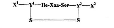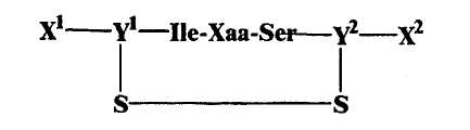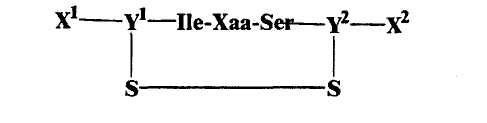 где X1 и X2 независимо представляют аминокислотный остаток или множество аминокислотных остатков до 10, связанных пептидными связями; Y1 и Y2 независимо представляют аминокислотные остатки, связанные друг с другом дисульфидной связью, и Xaa представляет собой аминокислотный остаток, выбранный из группы, включающей Asp, Asn, Glu и Gln. Предпочтительно, Y1 и Y2 представляют собой остатки цистеина, соединенные дисульфидной связью (то есть остаток цистина).