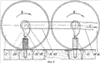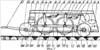 Каток с подвижными шпорами для подготовки оснований под автозимники на болотах (фиг.1) содержит раму 1 и установленные на ней рабочие органы в виде первого барабана 2 и второго барабана 3. На наружной поверхности каждого барабана – 2, 3 установлены подвижные шпоры 4. На раме 1 установлены теплогенераторы 5 с форсунками 6, емкость для топлива 7 с насосом и топливопроводами, электростанция 8 с топливным баком 9 и гидронасосная установка 10 с баком для гидрожидкости 11. Барабан 2 с подвижными шпорами 4 смонтирован первым в средней части рамы 1 посредством двух шарнирных звеньев 12, закрепленных на передних опорах 13, и двух гидроцилиндров 14, закрепленных на верхней балке 15 с возможностью вращения вокруг горизонтальной оси кулачкового валика 16 первого барабана 2 (фиг.3). Второй барабан 3 с подвижными шпорами 4 смонтирован вторым в средней части рамы 1 посредством двух шарнирных звеньев 17, закрепленных на задних опорах 18, и двух гидроцилиндров 19, закрепленных на верхней балке 15 с возможностью вращения вокруг горизонтальной оси кулачкового валика 16 второго барабана 3 (фиг.3). Первый барабан 2 и второй барабан 3 закрыты кожухами 20. Внутренние полости кожухов 20 соединены с теплогенераторами 5 через теплопроводы 21, оборудованные турбокомпрессорами. Рама 1 катка опирается на обрабатываемое дорожное основание 22 через два передних и два задних 23 уширенных пневмоколеса низкого давления. Дополнительный привод и взаимоположение по углу поворота первого и второго барабана осуществляются за счет установки цепной передачи 24 между первым 2 и вторыми 3 барабанами (фиг.3), цепной передачи 25 (фиг.3) от задних пневмоколес 23 (фиг.1) низкого давления на второй барабан 3, а также установки на задних пневмоколесах 23 низкого давления гидродвигателей 26. Агрегатируется каток с трактором – болотоходом типа Т-170 M1.01 посредством прицепного устройства 27. Первый барабан 2 и второй барабан 3 сконструированы и установлены на каток таким образом, что на первом барабане расстояние между шпорами в ряду 40, 40 и т.д. (фиг.2) и между рядами 40, 40 и т.д. (фиг.2) шпор увеличены в два раза, а на втором барабане 3 смонтированы шпоры 4 и расположены неподвижные кулачки 28 на кулачковом валике 16 (фиг.5) таким образом, что каждая из шпор 4 второго барабана 3 попадает со смещением по диагонали в среднюю часть расстояния между шпорами 4 в каждом ряду 40, 40 и т.д. (фиг.2) первого барабана 2, и каждый ряд шпор 4 второго барабана 3 попадает в среднюю часть между рядами 40 и 40 шпор 4 и т.д (фиг.2) первого барабана 2. С этой целью предусматривается соблюдение четкого взаимоотношения между угловым поворотом первого 2 и второго барабана 3 с помощью цепной передачи 24 (фиг.3). Первый барабан 2 и второй барабан 3 состоят из блока 29 (фиг.8) с гнездами 30 под сборки 31, сборки 31 (фиг.3, фиг.6) содержат подпружиненные шпоры 4 цилиндрической формы с роликами 32, неподвижного кулачкового валика 16 с кулачками 28 и стальной трубы 33 большого диаметра (трубы диаметром 1400 мм и более считаются трубами большого диаметра) с дополнительной промежуточной внутренней трубой 34 и отверстиями 35 круглой формы под шпоры 4 с уплотнительными устройствами типа уплотнений между штоком и крышкой обычного гидроцилиндра (на схеме не показано). Промежуточная внутренняя труба 34 предназначена для облегчения монтажа сборок 31 и блока 29 (фиг.8). Причем блок 29 (фиг.8) с гнездами 30 под с