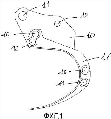Согласно конкретному примеру варианта осуществления на фиг.3 и 4 отдельно показаны два внутренних подвижных элемента 13 и 14. Подвижные элементы идентичны и зеркально симметричны, за исключением выступающего крыла, обозначенного ссылочными номерами 18 и 19. Эти крылья 18 и 19 предназначены соответственно для прикрепления подвижных элементов 13 и 14 к неподвижной конструкции 17.