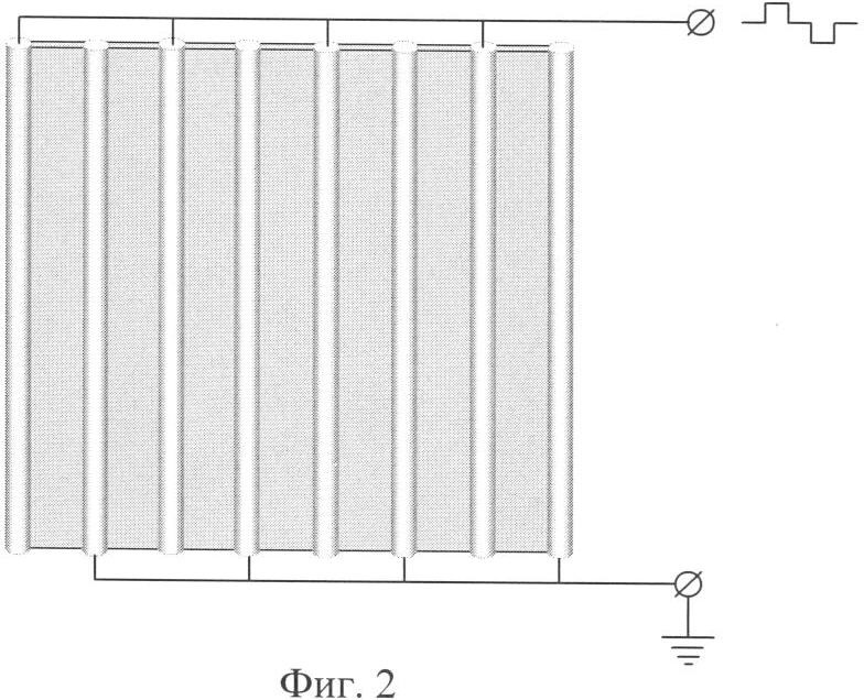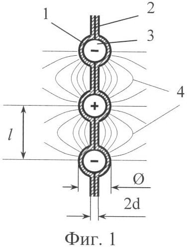 Фрагмент конструкции элемента конденсации показан на фиг.1, где приняты следующие обозначения: 1 и 2 – диэлектрические пленки, толщиной d; 3 – микропровода, несущие разнополярные электрические импульсные потенциалы; 4 – градиентные электрические силовые поля; 2d – толщина склеенных пленок; – внешний диаметр изоляции проводников; l – расстояние между проводниками. Диаметр может иметь характерный размер до 1 мм. Оптимальное расстояние между проводниками l заключено в интервале значений -10· .