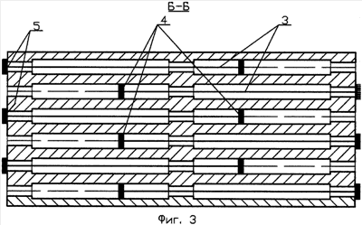 На фиг.2 показаны арматурные сетки 1 и каркасы 2. На фиг.3 штриховыми линиями показаны канаты 3 с анкерами 5, расположенными вплотную к торцам панели, и анкерами 4, удаленными от сужений пустот в теле бетона на расстояния, обеспечивающие предусмотренную расчетом стрелку провеса однопоясной системы, которую образуют канаты при разрушении панели, проскальзывая в сужениях до тех пор, пока анкеры 4 не приблизятся вплотную к сужениям пустот. Фрагменты разрушенной панели зависают на канатах и не приводят к гибели людей и порче дорогостоящего оборудования.