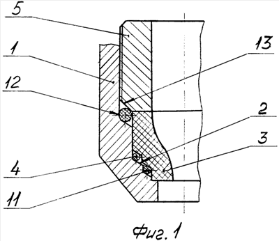 Промывочный узел содержит полый корпус 1 с коническим опорным уступом 2 на внутренней поверхности, на котором установлена гидромониторная насадка 3 с уплотнительным элементом 4. Насадка 3 поджимается к корпусу 1 нижним торцом фиксатора, выполненного в виде резьбовой втулки 5. Корпус 1 выполнен с тремя коническими участками 6, 7 и 8 на внутренней поверхности, а насадка 4 с двумя коническими участками 9 и 10 на наружной поверхности, расположенными оппозитно по отношению к нижним коническим участкам 7 и 8 корпуса 1. Конические участки 7, 8 корпуса 1 и 9, 10 – насадки 3 в рабочем положении смещены один относительно другого по высоте и образуют гнезда под основной 4 и нижний дополнительный уплотнительный элемент 11. При этом гнездо под верхний уплотнительный элемент 12 образовано коническим участком 6 корпуса 1 и коническим участком 13 нижней части резьбовой втулки 5. Конические участки 6-8 корпуса и 9-10 насадки выполнены в форме обратного конуса, т.е. когда вершина конуса обращена в сторону насадки 3. При этом угол конусности конических участков 6-8 корпуса и конических участков 9-10 насадки 3 уменьшается от участков с большим диаметром к участкам с меньшем диаметром, т.е. наибольший угол конусности имеет участок под верхний дополнительный уплотнительный элемент 12, а наименьший участок – под нижний уплотнительный элемент 11. Благодаря такому выполнению конических участков обеспечиваются одинаковые условия работы всех уплотнительных элементов 4, 11 и 12. Объясняется это тем, что уплотнительные кольца имеют разную площадь контакта с корпусом 1, а усилие поджатия, действующее на них от резьбовой втулки 5 одинаково. Благодаря же изменению угла наклона конических участков можно обеспечить одинаковую удельную нагрузку на уплотнительные элементы 4, 11 и 12 и тем самым обеспечить их равностойкость. Верхний уплотнительный элемент 12 расположен в зоне контакта корпуса 1, насадки 3 и фиксатора в виде резьбовой втулки 5 в гнезде, образованном коническими участками 6 и 13 соответственно корпуса 1 и резьбовой втулки 5. Нижний уплотнительный элемент 11 расположен в гнезде, образованном коническими участками 8 и 10 соответственно корпуса 1 и насадки 3, и смещен относительно основного уплотнительного элемента 4 в сторону оси насадки 3.