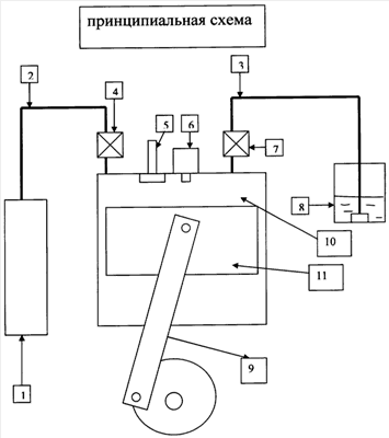 Схема, поясняющая принцип работы двухтактного ДВС, состоит из ресивера (1), воздухопровода (2), воздушной форсунки (4), выпускного клапана (5), топливной форсунки (7), камеры сгорания (10), поршня (11), кривошипно-шатунного механизма (9), топливного насоса (8), топливопровода (3), свечи зажигания (6).