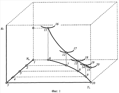 На каждом режиме работы тепловой машины имеется оптимальная температура наддувочного воздуха TSO, при которой тепловая машина имеет наилучшие показатели качества рабочего процесса и, главное, – наименьший расход топлива. Отклонения температуры TS в сторону увеличения или уменьшения от TSO приводит к увеличению расхода топлива тепловой машиной. Таким образом, на всех режимах работы тепловой машины зависимости удельного расхода топлива ge от температуры наддувочного воздуха TS имеют экстремальные, то есть минимальные значения (см. фиг.1 – зависимости оптимальных температур наддувочного воздуха от мощности (линии 6-10), минимального расхода топлива от температуры наддувочного воздуха (линии 11-15) и расхода топлива на заданном режиме работы тепловой машины от температуры наддувочного воздуха (линии 16-20)) [Тепловозные двигатели внутреннего сгорания / А.Э.Симсон, А.З.Хомич, А.А.Куриц и др. – М.: Транспорт, 1987. с.384, 385; Хомич А.З. Эффективность и вспомогательные режимы тепловозных дизелей. – М.: Транспорт, 1979. с. 70, 71; Хомич А.З., Тупицын О.И., Симеон А.Э. Экономия топлива и теплотехническая модернизация тепловозов. – М.: Транспорт, 1975. с.187, 199, 200].