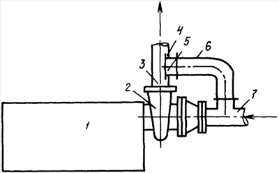 На чертеже представлен дизель с впускным и выпускным трактами, соединенными между собой перепускной трубой. Здесь 1 – дизель, 2 – турбокомпрессор, 3 – выпускной тракт, 4 – рычаг заслонки, 5 – заслонка, 6 – перепускной трубопровод, 7 – впускной тракт.