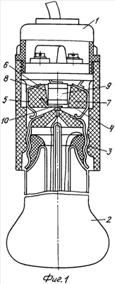 На чертежах (фиг.1-2) показано расположение переходника внутри патрона. На фиг.1 переходник выполнен в виде отдельного узла. На фиг.2 переходник выполнен заодно с резьбовым металлическим держателем лампочки.