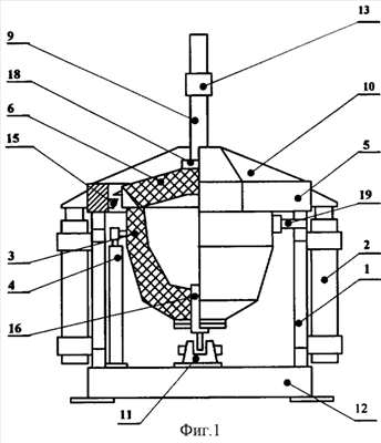 Для предотвращения выбросов газа и пыли из плавильного пространства в атмосферу цеха на портале смонтирован зонт газоотсоса (10). Для соединения с системой аспирации газов на зонте имеется соединительный патрубок (14) (фиг.2). Соединение зонта (10) с системой может быть телескопическим (труба в трубе) или иным. На своде (6), под соединительным патрубком (14), имеется газоотводящее отверстие.