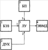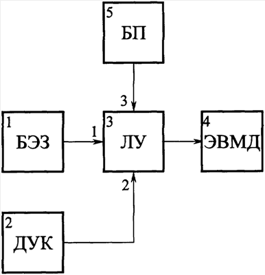 На чертеже приведена структура предлагаемого устройства, где 1 – БЭЗ, 2 – ДУК, 3 – ЛУ, 4 – ЭВМД, 5 – БП.