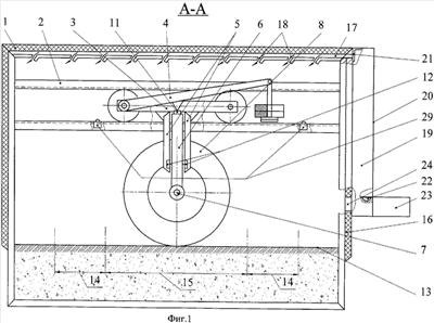 Поставленная цель достигается следующим образом. На фиг.1 показан общий вид стенда, на фиг.2 его разрез. В теплоизолированном контейнере 1 на двух направляющих 2 расположена грузовая тележка 3 с рычажно-грузовым устройством 4 и вертикальными направляющими 5, в которых скользит грузовая вилка 6, опирающаяся на вал 7 с автомобильным колесом 8. Вал 7 соединен с червячно-планетарным редуктором 9 и через него с электродвигателем 10. В верхней части грузовой вилки 6 расположен датчик давления 11 для измерения нагрузки на колесо 8 рычажно-грузового устройства 4, а в нижней части направляющих 5 находятся четыре датчика давления 12 (по два с каждой стороны) для измерения сдвиговых усилий от колеса 8. Автомобильное колесо 8 опирается на дорожную одежду 13, имеющую три участка: два участка торможения 14 и участок 15 разгона. Испытываемая дорожная одежда 13 укладывается в контейнере 1 на земляное полотно в соответствии со всеми нормативно-техническими требованиями. Наружная поверхность контейнера 1 покрыта теплоизоляцией 16, а внутри контейнера у потолка расположен короб 17 со щелями 18 для подвода горячего или холодного воздуха. На одной из стенок контейнера расположены нагревательное устройство 19 и холодильник 20, которые соединены через задвижки 21 с коробом 17. С противоположной стороны устройств 19 и 20 расположены задвижки 22, соединяющие нагревательное устройство 19 и холодильник 20 с вентилятором 23 и окном 24 во внутреннюю полость контейнера 1. В коробе 17 размещены дырчатые трубы 25 для имитации дождя. В нижней части контейнера 1 с двух сторон на уровне испытываемых слоев дорожных одежд расположены карманы 26 с отверстиями 27 в контейнере 1, которые закрыты геотекстилем 28. На направляющих 2 около зон торможения установлены с двух сторон грузовой тележки 3 путевые выключатели 29. Работой стенда по заданной программе управляет компьютер 30.