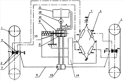 Предлагаемое устройство включает в себя рабочие колеса 1, установленные через подшипники 2 на осях 3, на которых также установлены втулки с тензодатчиками (электрическими датчиками боковой реакции дороги) 4. Оси 3 соединены поперечной рулевой тягой 5 переменной длины. Тензодатчики (датчики боковой реакции дороги) 4 на колесо 1 установлены на торцевых поверхностях втулок и имеют одинаковые электрические сопротивления, соединены по мостовой схеме 6. Точки А и В электрического моста 6 соединены с источником электропитания 7, а точки С и Д – с электромагнитной катушкой 8, сердечник которой связан с золотником 9 распределительного устройства 10 потока рабочей жидкости. Устройство также содержит емкость 11, насос 12, реверсивный механизм изменения рабочей длины поперечной рулевой тяги (гидроцилиндр) 13 и усилитель 14 электрического сигнала. Упругий элемент 15 (консольно закрепленная пластина) обеспечивает возвращение золотника 9 распределительного устройства 10 потока рабочей жидкости в центральное (нейтральное) положение.
