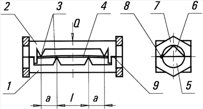 Устройство работает следующим образом. В изображенном на чертеже рабочем состоянии образец 4 изогнут, зазор между контактными поверхностями 9 основания и крышки отсутствует. В начале испытаний в каждой точке касания образца с опорами 3 на образец действует усилие Р0, которое создает в наружных слоях образца на участке между внутренними опорами напряжение 0, равное