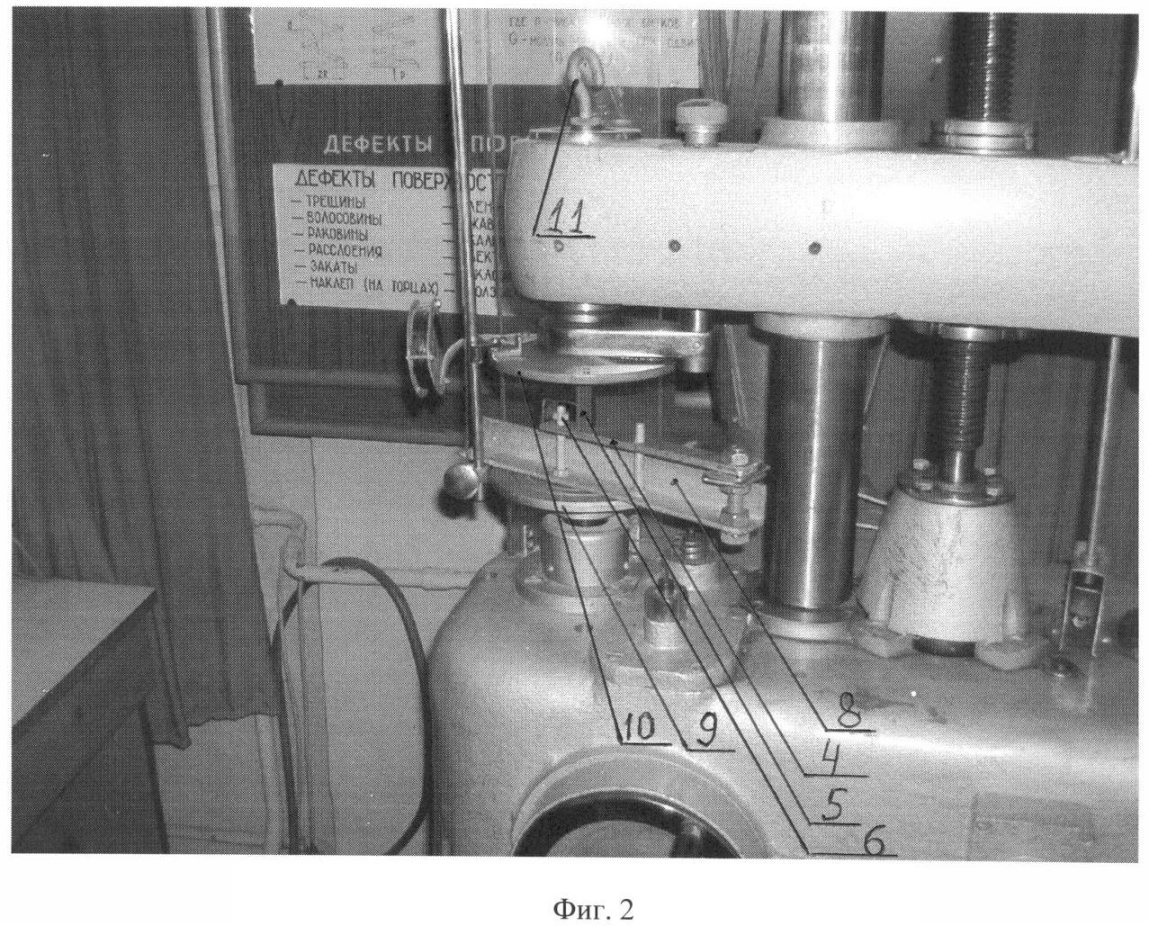 Последовательность работы по предлагаемому способу. Из материала ОК изготавливают измерительный образец в виде плоской балочки с отверстиями по концам (малого – под ось нагрузки 2, большого – под штангу 3 (см. фиг.1)) прямоугольного сечения шириной «b» и толщиной «h» и термически обрабатывают аналогично обработке ОК. На обе поверхности обоих торцов балочки от центра малого отверстия наносят изображение линейки с выбранной ценой деления, определяющей точность измерения напряжений. Образец 4 одевают на ось 2 и штангу 3, на которой жестко крепят гайкой 7, фиксирующую гайку 6 подводят с зазором к образцу 4, сверху устанавливают переходник 5 соосно с осью нагрузки 2 и в таком собранном виде нагружающее устройство устанавливают на нижнюю тарель 9 (см. фиг.2) машины МИП-100. Подводят верхнюю тарель 10 к съемному переходнику 5 и прижимают конец образца 4 (см. фиг.3) до выбранного значения силы Р, величину которой контролируют по циферблату 12 (на фиг.3 Р=9,5 кгс). После чего гайку 6 подводят вплотную к образцу 4 (при этом стрелка на циферблате не должна изменить свое положение).