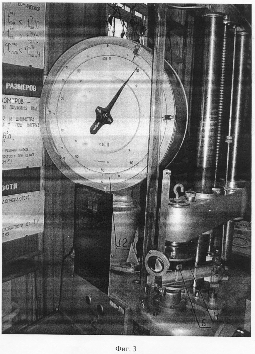 На фигуре 3 представлена машина МИП-100 с образцом 4 в нагруженном состоянии, где 6 – фиксирующая гайка закручена до контакта с образцом 4; 12 – циферблат, видно на нем, что сила Р=9,5 кгс.