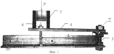 На фигуре 1 представлено устройство для дозированного нагружения контрольного образца, где 1 – корпус нагружающего устройства; 2 – ось нагрузки; 3 – жесткая штанга крепления образца; 4 – измерительный образец; 5 – съемный переходник с окном для подхода к фиксирующей гайке 6; 7 – гайка крепления образца; L – плечо изгибающего момента от силы Р до места контроля (на фигуре Lmax – до места заделки образца).
