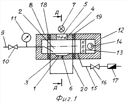 Гигрометр по варианту 1 (Фиг.1, Фиг.2) включает холодопровод 1, измерительную камеру 2, в которой выполнена выточка 3, отверстие 4, защитное стекло 5, датчик температуры 6, источник света 7, обойму 8, входной трубопровод 9 с клапаном 10 и манометром 11, обойму 12 с защитным стеклом 13, фотоприемник 14, выходной трубопровод 15 с клапаном 16 и расходомером 17, теплоизолирующие прокладки 18, 19 и охладитель 20.