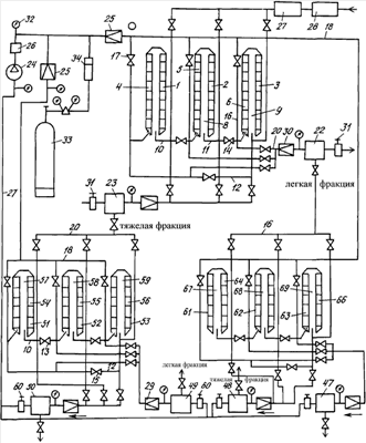 Количество степеней разделения зависит от количества фракций и заданной глубины переработки исходной многокомпонентной смеси. Предлагаемая схема позволяет эффективно перерабатывать многокомпонентные сложные смеси в непрерывном режиме разделения с высокой производительностью.