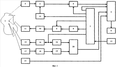 На фиг.1 обозначено: лоцируемый объем пространства 1; объектив 2 с интерференционным светофильтром на 1; электронно-оптический преобразователь (ЭОП) 3; фотоприемник 4 с объективом на входе, выполненный телевизионным; блок обработки 5; видеоконтрольный блок 6; синхрогенератор 7; делитель 8 кадровой частоты; модулятор 9; импульсный лазер 10 на 1; первый объектив 11; блок 12 затворных импульсов; пульт 13 управления; лазер 14 с «ножевой» диаграммой излучения на 2; второй объектив 15; формирователь 16 импульсов запрета; объектив 17 с интерференционным светофильтром на 2; фотоприемник 18; блок 19 выделения световозвратного сигнала обнаруживаемого объекта; схема И 20; электронный компас 21.