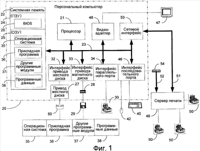 На жестком диске 60, магнитном диске 29, ПЗУ 24 или ОЗУ 25 может храниться ряд программных модулей, в том числе операционная система 35, одна или несколько прикладных программ 36, другие программные модули 37 и программные данные 38. Пользователь может вводить команды или информацию в ПК 20 посредством устройств ввода, например, клавиатуры 40 и указательного устройства 42. Другие устройства ввода (не показаны) могут включать в себя микрофон, джойстик, игровой пульт, спутниковую антенну, сканнер и т.п. Для подключения этих и других устройств ввода к процессору 21 часто используют интерфейс 46 последовательного порта, подключенного к системной шине, но можно использовать и другие интерфейсы, например последовательный порт 34, игровой порт или универсальную последовательную шину (УПШ, USB). Монитор 47 или устройство отображения другого типа также может подключаться к системной шине 23 через интерфейс, например, видеоадаптер 48. Помимо монитора, ПК обычно содержат другие периферийные устройства вывода, например громкоговорители и принтер 30, подключенный к системной шине 23 через интерфейс 34 параллельного порта. ПК 20 может работать в сетевой среде с использованием логических соединений с одним или несколькими удаленными компьютерами, например сервером 49 печати. Сервер 49 печати может представлять собой другой ПК, сервер, маршрутизатор, сетевой ПК, равноправное устройство или другой общий узел сети и обычно содержит многие из элементов, описанных выше применительно к ПК 20, хотя сервер 49 печати предназначен для маршрутизации запросов печати с ПК 20 на присоединенные принтеры 50. Логические соединения, обозначенные на фиг.1, включают в себя локальную сеть (ЛС) 51 и глобальную сеть (ГС) 52. Такие сетевые среды обычно реализуются в виде компьютерных сетей в пределах учреждения, предприятия, интранетов и Интернета.