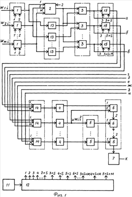 В дальнейшем работа устройства повторяется в уже описанном порядке. Во второй группе из S группы 15 регистров фиксируется значение W2i за счет сигнала с четвертого выхода распределителя 12 импульсов. В S-ой группе 15 регистров появляется значение Wмi за счет сигнала с (2+S)-го выхода распределителя 12 импульсов. Следовательно, все элементы с 1-й по S-ю групп 15 регистров будут заполнены. Причем в первых элементах с 1-й по S-й групп 15 регистров записаны значения Wji ( W1i) для 1-й организации, а в последних М-х элементах с 1-й по S-ю групп 15 регистров фиксируются значения Wji ( Wмi) для М-ой организации.