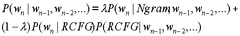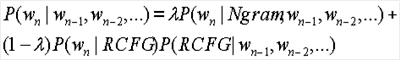 где LCFG и RCFG обозначают левый и правый контекст внедренной N-граммы соответственно. Процесс поиска обрабатывает тэг как маркер и расширяет в N-грамму, как при вводе регулярного не-терминала. Атрибут «max» в тэге задает максимальное количество слов, которые может потребить N-грамма. Внутри этой N-граммы вероятность строки слов вычисляется путем интерполяции отката N-граммы с PCFG, а именно