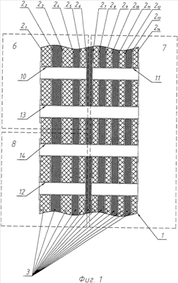 Зона 6 аналоговой обработки сигналов и зона 8 формирования цифрового питания занимают участки в проводящих слоях с первого по n-й, а расположенная под ними зона 7 цифровой обработки сигналов занимает участки в проводящих слоях с (n+1)-го по N-й, где n 6, N-n 6. B рассматриваемом примере, отвечающем случаю N=14, n=6, N-n=8, зона 6 аналоговой обработки сигналов и зона 8 формирования цифрового питания располагаются в первых шести проводящих слоях 21, 22, 23, 24, 25, 26 (фиг.1, 2, 4-9), а зона 7 цифровой обработки сигналов занимает остальные восемь проводящих слоев 27, 28, 29, 210, 211, 212, 213, 214 (фиг.1, 3, 10-17). При этом участки зоны 6 аналоговой обработки сигналов и зоны 8 формирования цифрового питания, находящиеся в одних и тех же проводящих слоях, отделены друг от друга разделительными полосами 9, лишенными металлизации (фиг.4-9).