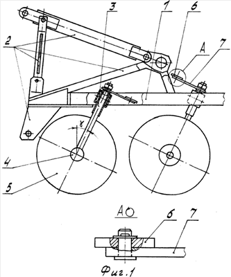 Борона (см. фиг. 1) содержит раму 1, присоединительное устройство к трактору 2, стойки 3 дисков 5, вращающихся при регулировке вокруг своей оси, размещенные к вертикали под углом , подшипниковый узел 4, диски 5 и механизм поворота стойки диска, включающий тягу 6 и рычаг 7 (винтовой механизм не показан).