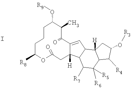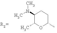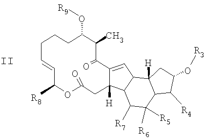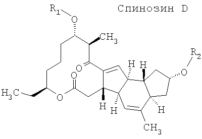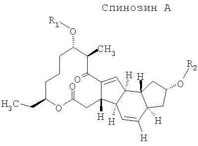 описанные в заявке на европейский патент №375316 А1, Boeck и др., и в заявке на международный патент №97/00265 А1, Deamicis и др., для ознакомления с ними следует обратиться к этим ссылкам. Как спинозины рассматриваются здесь также синтетические и полусинтетические производные натуральных спинозинов и соответственно производные, которые выделяют из генетически модифицированных штаммов, например разновидностей Saccharopolysporan, в соответствии с материалами заявок на международные патенты №02/77004 и №02/77005, для ознакомления с ними следует обратиться к этим ссылкам. В качестве примеров можно назвать соединения формул I и II, где R3 означает гликозид (R3=R1), R4 означает атом водорода, гидроксильную группу или алкоксигруппу (обычно с числом атомов углерода от одного до восьми, в предпочтительном случае от одного до четырех); R5 означает атом водорода, метильную группу; R6 и R7 означают атом водорода или же оба они преобразуются в двойную связь или в эпоксидную группу; R8 в формуле I означает транс-1-бутенильную, 1,3-бутадиенильную, бутильную, 3-гидроксибутенильную, пропильную, 1-пропенильную, 1,2-эпокси-1-бутильную, 3-оксо-1-бутенильную группу, группы СН3СН(ОСН3)СН=СН-, СН3СН=СНСН(СН2-CO2СН3)- или СН3СН=СНСН[СН2CON(СН3)2]-; R9 означает атом водорода или гликозидный остаток (R9=R2). Другие эффективные соединения, проявляющие активность в качестве агонистов никотиновых рецепторов, которые также могут с успехом комбинироваться с соединениями группы I, представлены, например, никотином или нитиазином