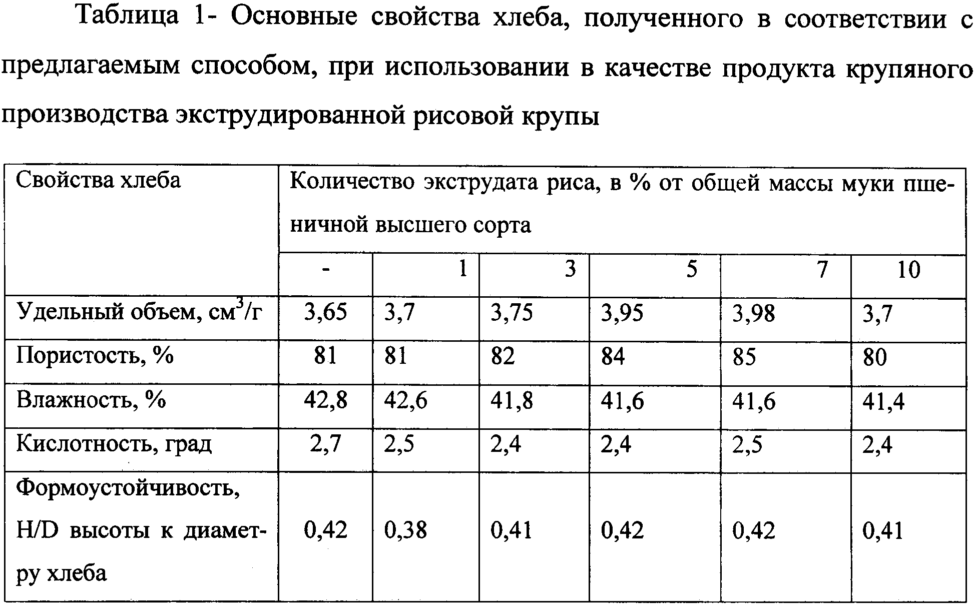Изобретение относится к пищевой промышленности и может быть использовано в производстве хлеба. Недостатками описанного выше способа производства хлеба являются повышенная трудоемкость осуществления способа производства хлеба вследствие приготовления заварки с заданным соотношением дробленого риса и горячей воды; сложность использования молочной сыворотки, так как данный продукт быстро накапливает кислотность, что приводит к его порче и снижает качество готовых изделий. Наиболее близким к предлагаемому изобретению по технической сущности (прототипом) является способ производства хлеба путем смешивания муки пшеничной высшего сорта, дрожжей хлебопекарных прессованных, воды и предварительно подготовленного продукта переработки риса, выбраживания опары, замеса теста путем смешивания опары, соли, воды и оставшегося количества муки пшеничной высшего сорта, выбраживания теста, разделки, расстойки и выпечки или путем замеса теста из муки пшеничной высшего сорта, дрожжей хлебопекарных прессованных, соли, воды, предварительно подготовленного продукта переработки риса, выбраживания теста, разделки, расстойки и выпечки. В качестве продукта переработки риса используют рисовую мучку, консервированную добавлением пропионовой кислоты в количестве 0,01-0,5% по массе. Замешенное тесто выбраживают, делят на куски заданной массы, округляют. Далее тестовые заготовки подвергают расстойке и выпечке (патент RU №2099951, МПК 6 A21D 115/00. A21D 2/36). Недостатками описанного способа производства хлеба являются трудоемкость производства вследствие необходимости точного дозирования пропионовой кислоты при предварительной подготовке рисовой мучки; длительность процесса производства, обусловленная предварительной подготовкой продукта переработки риса. При этом существует опасность передозировки пропионовой кислоты, вызывающая существенное снижение органолептических показателей хлеба. Предлагаемым изобретением решается задача снижения трудоемкости и сокращения продолжительности процесса производства хлеба с обогащенным составом при сохранении высокого качества и потребительских свойств. Для решения поставленной задачи способ производства хлеба согласно изобретению предусматривает опарный и безопарный методы, причем при опарном методе готовят опару из части муки пшеничной высшего сорта, дрожжей хлебопекарных прессованных и воды, выбраживают ее и замешивают тесто из опары, соли, воды, экструдированной рисовой крупы и оставшейся части муки пшеничной высшего сорта, выбраживают тесто, подают на разделку, расстойку и выпечку, а при безопарном методе замешивают тесто из муки пшеничной высшего сорта, дрожжей хлебопекарных прессованных, соли, воды и экструдированной рисовой крупы, выбраживают тесто, подают на разделку, расстойку и выпечку, при этом экструдированную рисовую крупу добавляют в количестве 5-7% от общей массы муки пшеничной высшего сорта. Снижение трудоемкости и продолжительности процесса производства хлеба обусловлены отсутствием необходимости предварительной подготовки продукта переработки риса. Получение хлебобулочных изделий высокого качества вызвано использованием в качестве продукта переработки риса экструдированной рисовой крупы, что обогащает тесто дополнительным количеством пищевых волокон, белка, са