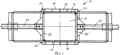 В варианте или в другом осуществлении боковые стенки 14 (см. Фиг.3), аналогичные торцевым стенкам 20, 20′, выполнены из металлических пластин, предпочтительно – из нержавеющей стали, также толщиной более 1,25 см, например, 2,54 см. Согласно этому альтернативному выполнению какая-либо стенка после диафрагмы не является прозрачной для ударной волны, и поэтому разрежение или напряжение не создается.