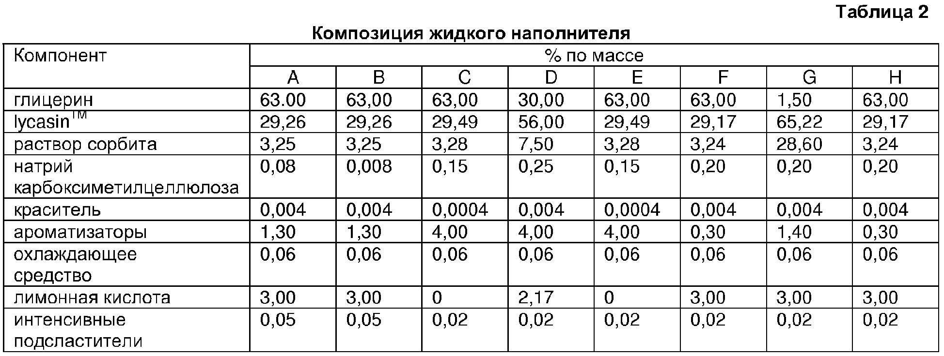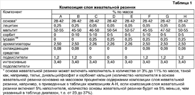 Получают куски жевательной резинки, включающие три области: жидкий наполнитель, слой жевательной резинки и покрытие, в соответствии с композициями, приведенными выше в таблицах 1-3, причем каждая из областей состоит из соответствующих компонентов, указанных для композиций A-H. Композиции слоев жевательной резинки получают, смешивая на первой стадии тальк, если он присутствует в композиции, с основой жевательной резинки при нагревании примерно до 85°C. Затем эту комбинацию перемешивают с мальтитом, лецитином и другими полиолами в течение шести минут. Добавляют смеси вкусоароматических добавок, которые включают премикс ароматизаторов и охлаждающих агентов, и перемешивают в течение 1 минуты. Наконец, добавляют кислоты и интенсивные подсластители и перемешивают в течение 5 минут. Затем получают композиции жидкого наполнителя, во-первых, получая премикс натриевого производного карбоксиметилцеллюлозы, глицерина и полиолов. Этот премикс затем объединяют с красителями, вкусоароматическими добавками, охлаждающими средствами, кислотами и интенсивными подсластителями и перемешивают. Затем композиции слоя жевательной резинки и жидкого наполнителя подвергают совместной экструзии и из полученного продукта формируют таблетки, способом, описанным выше в параграфах [0027]-[0030]. Каждый из кусков жевательной резинки имеет общую массу примерно 2,2 г. В полученных кусках жевательной резинки слой собственно жевательной резинки составляет примерно 62% по массе, жидкий наполнитель составляет около 8% по массе и покрытие составляет примерно 30% по массе. Куски жевательной резинки, включающие композиции A-H, не демонстрируют заметной потери жидкого состояния заполненного жидкостью центра после ускоренного старения при 37°C в течение трехнедельного периода. Примеры I-P