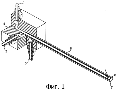 На фиг.1 показан перспективный план (аксонометрия) устройства (тройная игла) согласно изобретению, а на фиг.2 показан увеличенный вид выпускного отверстия этого устройства.