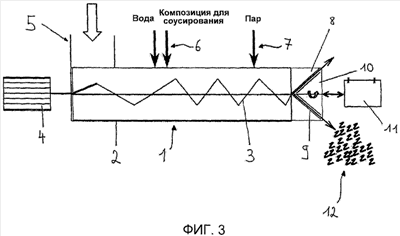 Ниже вариант выполнения устройства согласно изобретению поясняется более подробно на основе фиг. 3. На ней представлено устройство согласно изобретению для расщепления на волокна под давлением, обозначенное в целом позицией 1. Оно содержит корпус 2 камеры и предусмотренный в нем транспортный шнек 3, который приводится во вращение от двигателя 4. Далее на фиг. 3 представлены также загрузочное устройство 5 табачного материала и, при необходимости, впускные устройства для воды, композиции для соусирования (и/или ароматизирующей добавки) и пара, обозначенные позициями 6 и 7. На выходном конце (на чертеже справа) камера содержит головку 8, образующую внутренний конус. Внутренняя конусная стенка головки 8 образует вместе с наружной конусной стенкой внешнего конуса 10 щель 9, через которую может выходить подаваемый шнеком 3 табачный материал. На вершине щели внутреннего конуса 8 находится отверстие внутрь камеры 2. Выходящий, расщепленный на волокна табачный материал обозначен позицией 12.