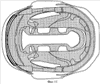 Затылочная внутренняя демпфирующая прокладка 54 может быть получена из полипропилена (ЕРР) или из пенополиэтилена (ЕРЕ). Без отклонения от сущности настоящего изобретения могут быть также использованы другие материалы. Затылочная внутренняя демпфирующая прокладка 54 имеет внутреннюю поверхность 56 и может содержать левую и правую затылочные комфортные подкладки 58, 60, позиционируемые симметрично относительно продольной оси шлема 10 на внутренней поверхности 56 (смотри фиг.5). Затылочные левая и правая комфортные подкладки 58, 60 могут быть получены из поливинилхлорида (PVC), но без отклонения от сущности настоящего изобретения могут быть также использованы другие материалы. Затылочные левая и правая комфортные подкладки 58, 60 могут быть прикреплены на внутренней поверхности 56 затылочной внутренней демпфирующей прокладки 54 с помощью любого пригодного средства, например клеем, стежками, скрепками, скобками или заклепками. В альтернативном варианте затылочная внутренняя демпфирующая прокладка 54 может содержать одноэлементную комфортную подкладку на внутренней поверхности 56.