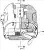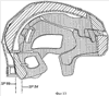 Передний корпус 16 перекрывает переднюю внутреннюю демпфирующую прокладку 22 и верхнюю внутреннюю демпфирующую прокладку 30, тогда как задний корпус 18 перекрывает заднюю центральную внутреннюю демпфирующую прокладку 24 и левую и правую боковые внутренние демпфирующие прокладки 26, 28 соответственно. Передняя внутренняя демпфирующая прокладка 22 обращена к передней части теменной области CR, тогда как верхняя внутренняя демпфирующая прокладка 30 обращена к верхней части теменной области CR. Центральная задняя внутренняя демпфирующая прокладка 24 обращена к задней области BR, тогда как левая и правая боковые внутренние демпфирующие прокладки 26, 28 соответственно обращены к соответствующим левой и правой боковым областям LS, RS соответственно. Внутренние демпфирующие прокладки 22, 24, 26, 28 могут быть получены из ударопоглощающих материалов, например из пенопропилена (ЕРР) или пенополиэтилена (ЕРЕ). Без отклонения от сущности настоящего изобретения могут быть использованы также другие материалы.