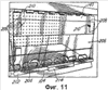 В одном варианте выполнения на верхней части витринной системы 100 может быть установлен стационарный кожух 180. Кожух 180 обеспечивает защиту и дает место для размещения графики, и в нем можно хранить товары. Кожух 180 обеспечивает защиту тем, что работает как верхняя стенка или барьер, препятствующий доступу к товару сверху. Кожух 180 может монтироваться на уже существующую полку. Кожух 180 может быть фиксированным или регулируемым. В случае регулируемого кожуха, кожух можно устанавливать в разных положениях на витринной системе. Кроме того, кожух 180 может быть выдвижным, работающим подобно иллюстративной выдвижной полке 104, описанной выше. Кроме того, кожух 180 также может служить полкой для хранения товара. Другими словами, витринная система 100 может содержать множество кожухов 180, которые работают как полки для хранения или демонстрации товаров. Кожух также может быть выполнен с возможностью крепления на барьеры 130, 140 различными известными способами крепления. В иллюстративном варианте на кожух 180 можно установить ящик 108 с запираемой дверцей 109, как показано на фиг.9, для дополнительного хранения товаров и размещения графики.